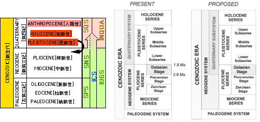 なお、この提案はINQUA のCommission on Stratigraphy and Chronology での討論をとばしてICS が出したものであり、INQUA として十分議論したものでないことを付記しておきます。日本第四紀学会としてはこの改正の提案を重大な問題として受け止め、幹事会で対応を検討中です。