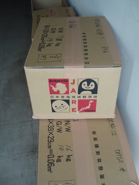 梱包中の段ボール.南極観測隊用にレンゴーが提供してくれているもので,大中小のサイズがある.作りはしっかりしていて,13年前のJARE34で使った箱は現在でも現役.